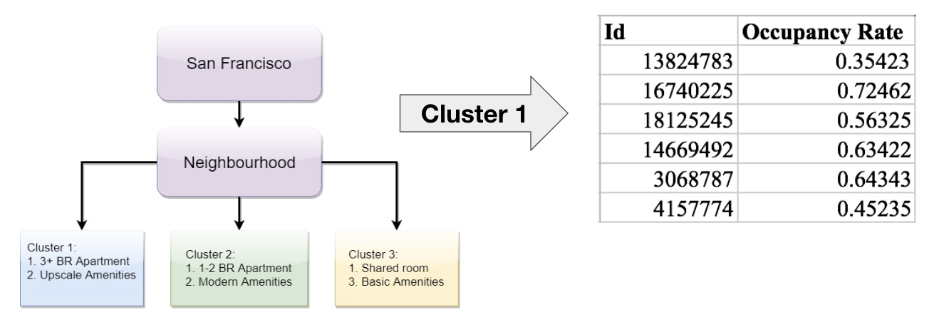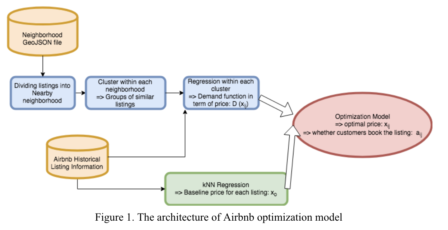 起初,我们计划建立两个独立的模型来预测列表价格和需求。其中一个模型使用k-Means对3英里半径内的所有Airbnb列表进行分组,以找到相似的附近房产群,并采用每月平均出租率来估计每个群组内的预期每月需求。